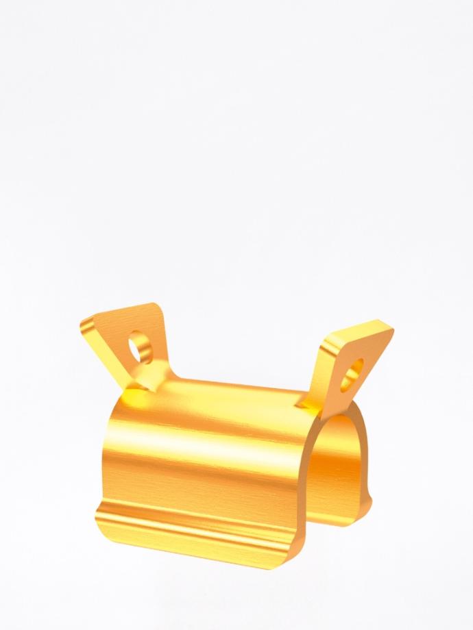 Componente Femmina del sistema di barra ritentiva a profilo rotondo con cavaliere. Realizzata in lega nobile gialla Elitor®, ha una lunghezza di 3,5 mm e presenta due alette regolabili tramite il set di attivatori. La femmina E si incorpora nella resina e non deve essere lavorata, salvo un unico piegamento delle alette per adattarle al profilo.