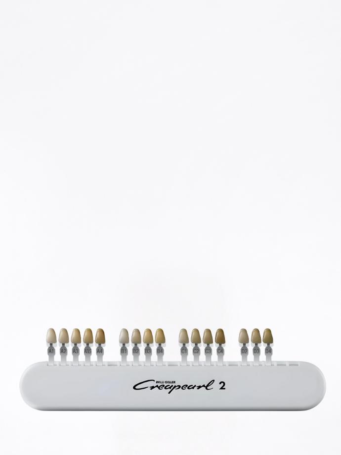Guida colore per denti artificiali Creapearl 2 composta dai campioni di tonalità suddivisi per i 16 colori della Scala VITA, per la comparazione cromatica con i denti reali in fase di realizzazione della protesi odontoiatrica.