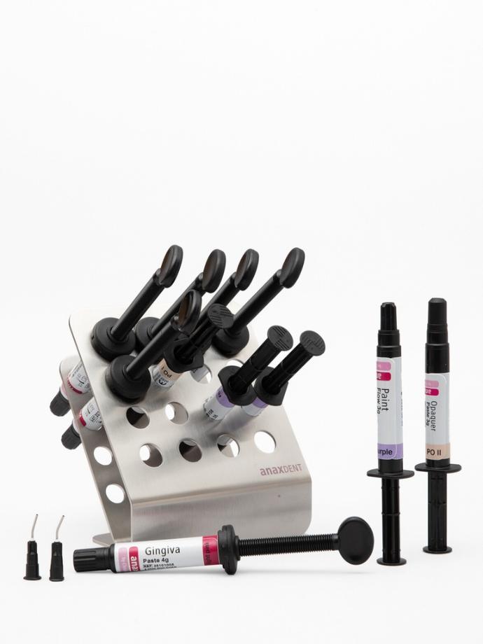 Il Kit XL è un assortimento completo di compositi anaxgum per effettuare restauri della gengiva completi e che può essere esteso a piacere: