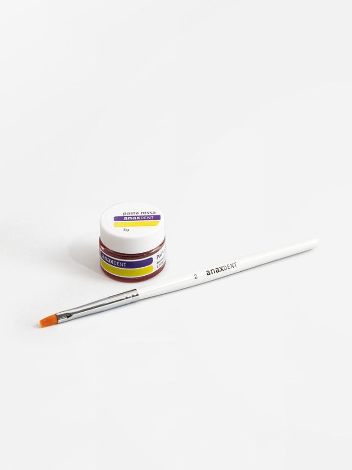 Pasta Rossa di anaxdent è una pasta di contatto per il controllo visivo, specifica per il rilevamento di difetti durante l'inserimento della protesi dentale, ottima per essere impiegata su parti in ceramica integrale. La Pasta Rossa si applica in uno strato molto sottile tramite il pennello anaxbrush incluso risaltando le tonalità, senza lasciare residui e si rimuove facilmente con dell’acqua.