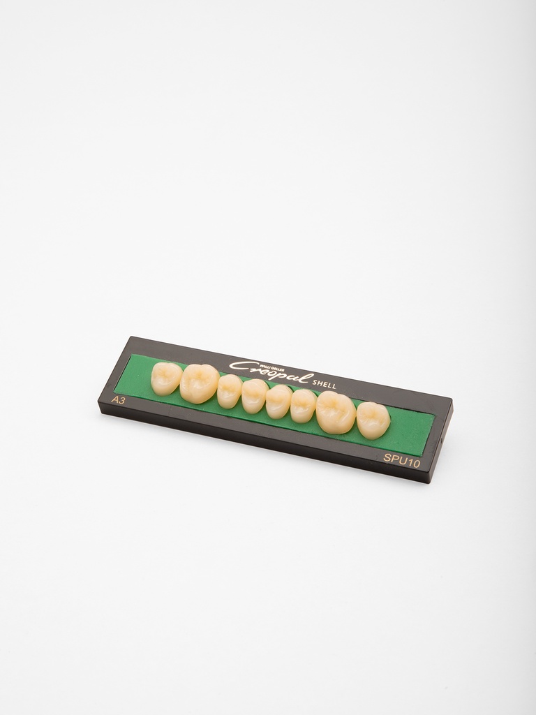 Creopal Posterior Shell è la linea di faccette posteriori in composito realizzate con un metodo a due strati. La loro forma più sottile, rispetto alla linea Creopal Posterior, la rende ideale per lavori in cui lo spazio è limitato. I denti artificiali Creopal Shell Posterior vengono utilizzata per mock-up, prove estetiche o ricostruzioni dentali parziali o totali. Disponibili in 7 colori della scala VITA A1-B3 e in 8 forme differenti SPU10, 19 - SPL10, 19