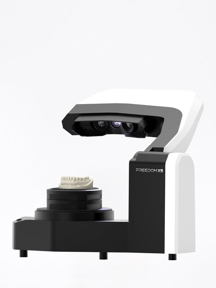 Lo scanner 3D DOF Freedom X5 è uno scanner da banco dotato di due fotocamere da 5 mega pixel in Ultra-HD con l’innovativo sistema brevettato DOF Camera Moving System. Questo sistema consente alle fotocamere montate sul braccio di muoversi liberamente durante la scansione del modello, senza doverlo fissare, ottenendo scansioni molto più accurate rispetto alle altre soluzioni presenti sul mercato con una notevole riduzione di tempo di elaborazione dell’immagine di circa il 30%. L'innovativa tecnologia delle fotocamere produce dati in alta risoluzione che migliorano la produttività dell'operatore riducendo gli errori durante la fase di scansione e, dunque, le ore di lavoro necessarie. La presenza di un joystick è utile per selezionare le fasi di scansione, con la possibilità di aggiungere la scansione a colori.